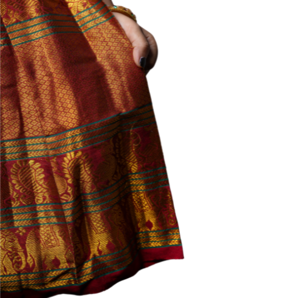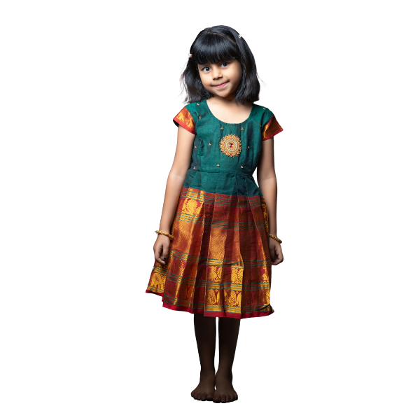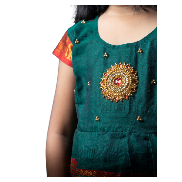 CompareThis beautifully hand-stitched frock is made from Banhatti fabric and features handmade Aari work, showcasing the elegance of the fabric. The frock is sleeveless and has tying belts for the best fit.