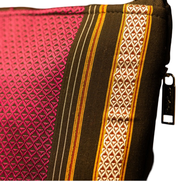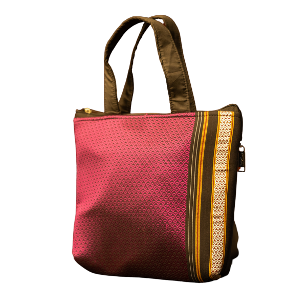 CompareThis handcrafted bag is made from Khan fabric and features two small polyester handles. It is lightweight and easy to carry for daily use. The bag has one main compartment with a secure zipper closure and an inner zip pocket for added convenience.