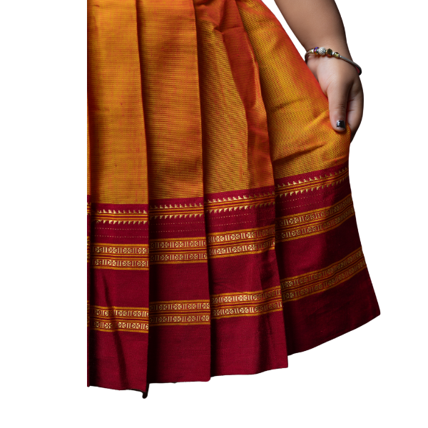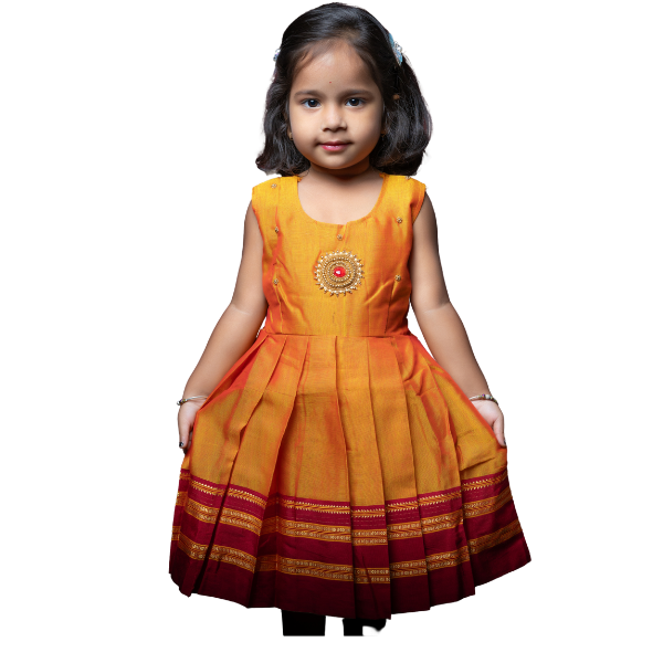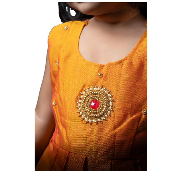 CompareThis beautifully hand-stitched frock is made from Khan fabric and features intricate handmade Aari work, enhancing the elegance of the fabric. The frock is sleeveless and has tying belts for the best fit.